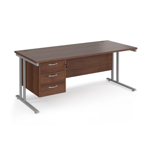 Maestro 25 straight desk 1800mm x 800mm with 3 drawer pedestal - silver cantilever leg frame, walnut top